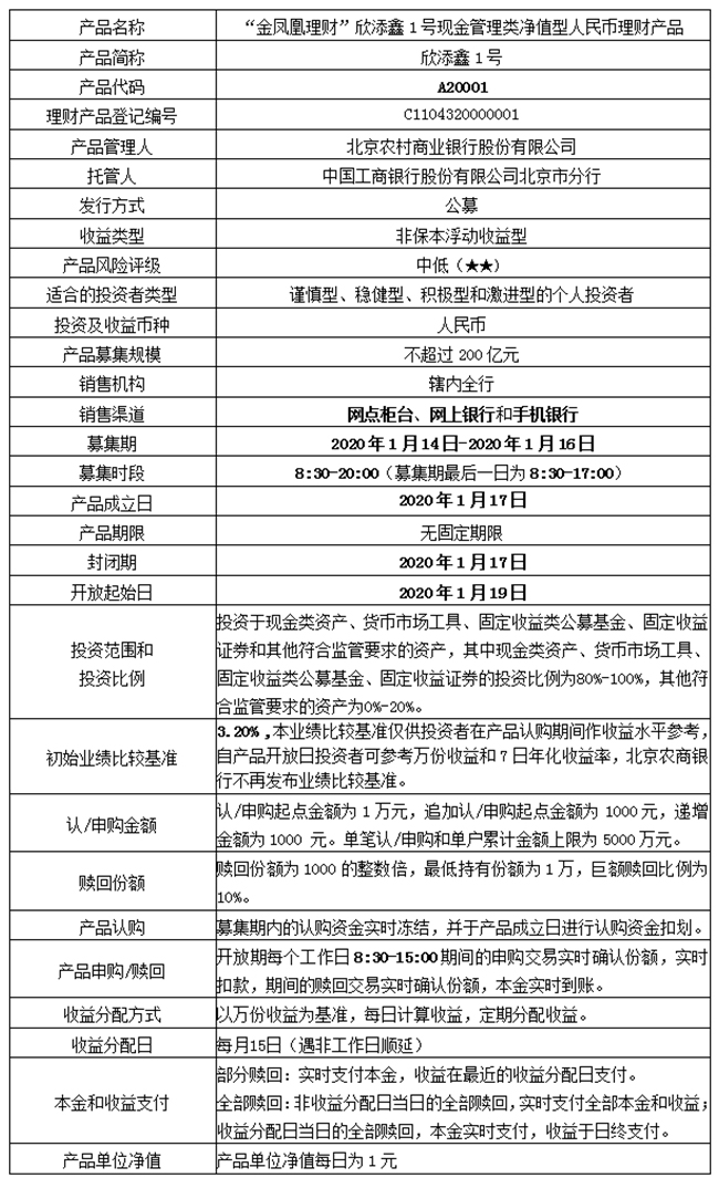 我行定于2020年1月14日至1月16日发行欣添鑫1号现金管理类净值型理财产品,产品具体信息如下:
