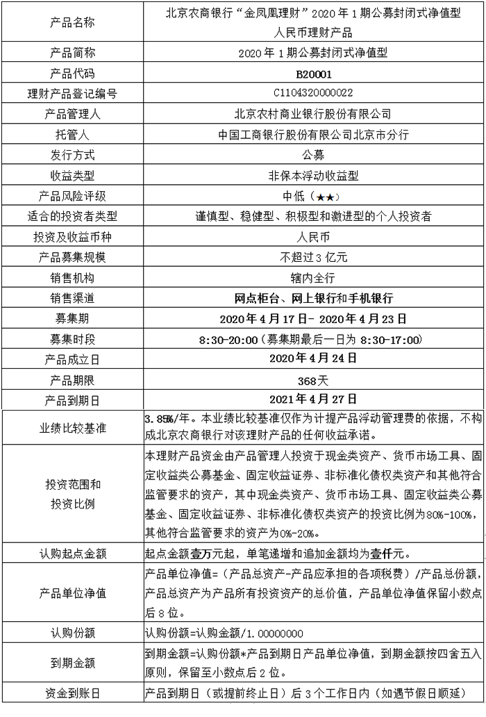 我行定于2020年4月17日至4月23日发行2020年1期公募封闭式净值型人民币理财产品,产品具体信息如下: