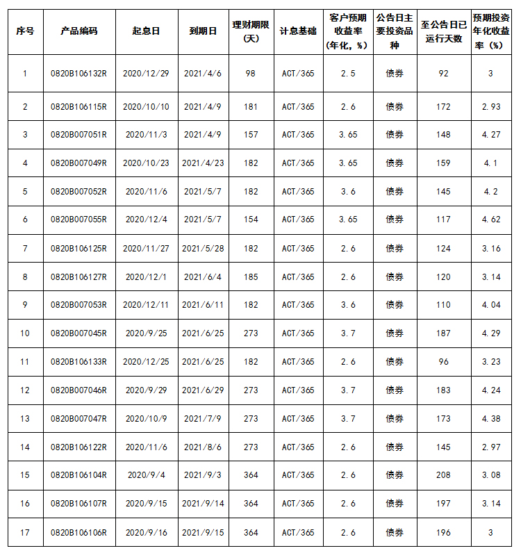 截至2021年3月31日,上述产品运行情况良好,投资组合年化收益率达到本期产品说明书约定的客户预期收益率。感谢您一直以来对北京农商银行的信赖与支持!我们将竭诚为您提供更为安全、稳健、优质的理财服务,敬请继续关注我行理财产品。