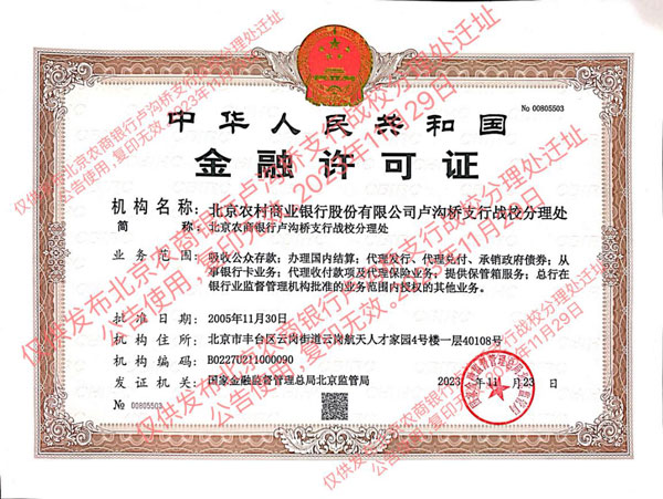 北京农商银行下列机构经国家金融监督管理总局北京监管局批准,换发《中华人民共和国金融许可证》,现予以公告: