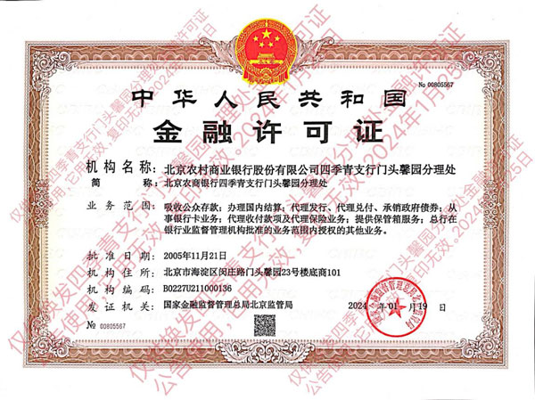 北京农商银行下列机构经国家金融监督管理总局北京监管局批准,换发《中华人民共和国金融许可证》,现予以公告: