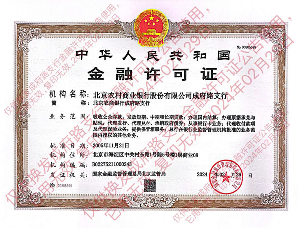 发证机关:国家金融监督管理总局北京监管局