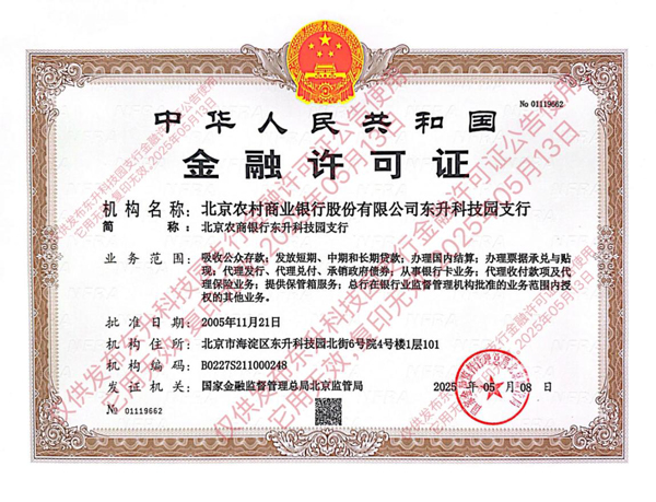 北京农商银行下列机构经国家金融监督管理总局北京监管局备案,换发《中华人民共和国金融许可证》,现予以公告: