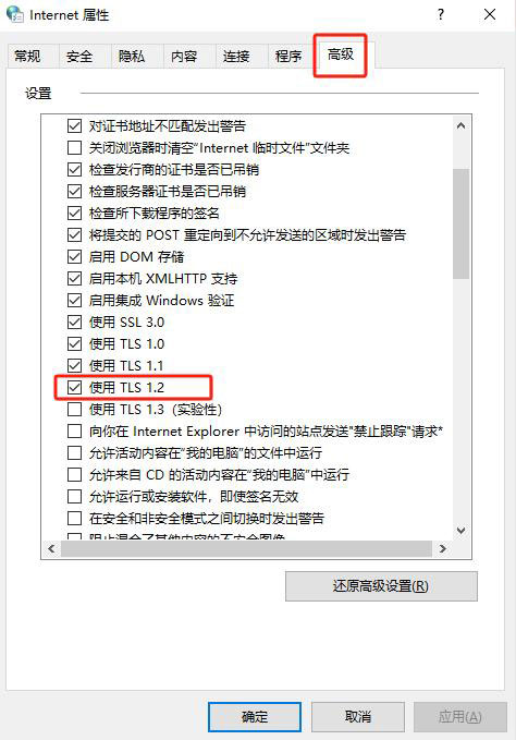 如您使用的是IE浏览器,通过“IE设置--Internet选项--高级”中,勾选“TLS1.2”,并关闭和重新启动浏览器。
