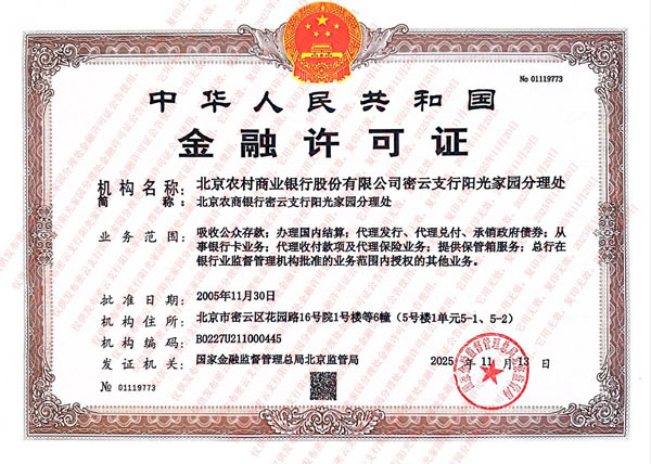 机构名称:北京农村商业银行股份有限公司密云支行阳光家园分理处