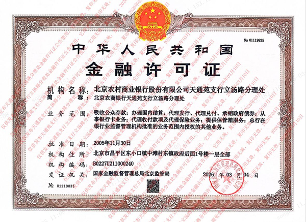 机构名称:北京农村商业银行股份有限公司天通苑支行立汤路分理处