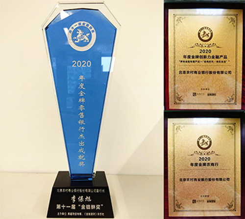 2021年3月18日,在“第十一届中国金融创新与发展论坛暨2020年度‘金貔貅奖’颁奖盛典”上,北京农商银行荣获年度金牌农商行奖,养老金融专属产品“金色时光·快乐生活”荣获年度金牌创新力金融产品奖,李保旭副行长荣获年度金牌零售银行杰出成就奖。