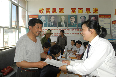 北京农村信用社员工热情为农户送贷上门。
