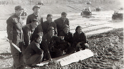 农信社发放大量贷款支持“农业学大寨”运动,图为北京农村信用社员工考察农村农田水利建设场景。