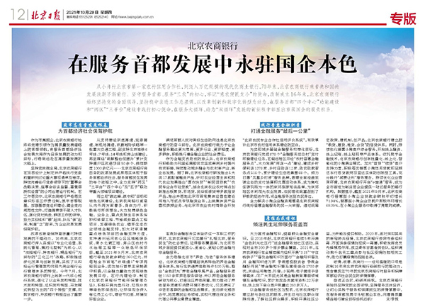2021年10月28日,《北京日报》刊发《北京农商银行 在服务首都发展中永驻国企本色》,报道了北京农商银行始终坚持党的全面领导,坚定推进稳健可持续高质量发展,在助力首都经济发展、服务社会大众、履行社会责任、聚力脱贫攻坚中,勇扛使命职责、彰显硬核担当的积极作为与典型成效。
