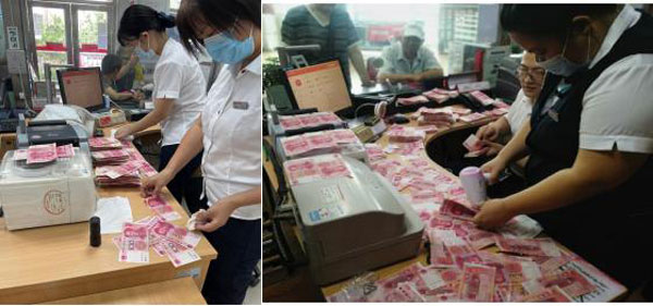 暴雨过后,受灾群众纷纷拿来泡水现金到网点兑换,大部分是老人省吃俭用攒下的养老钱,这些现金已经被洪水浸泡湿透,网点员工第一时间安抚客户的情绪,用吹风机仔细完成现金的吹干、面额分拣、整理和识别等工作,经过数小时的清点,成功将兑换现金送到客户手中,让客户满意而归。
