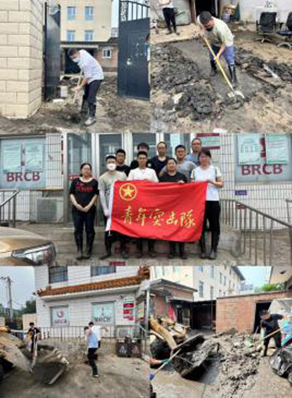 在道路抢通后,门头沟支行迅速组建灾后重建突击队,首站前往门头沟王平分理处开展灾后恢复工作。地处山区的王平分理处在此次灾情中受损严重,营业厅内进水,室内外淤泥堆积,部分机具受损,网点外围环境被严重破坏,在进行全面安全评估后,这支由党员、青年员工组成的突击队全力开展营业室内外清淤和消毒工作,检查房屋及周边情况,为后续恢复营业做好充足准备。