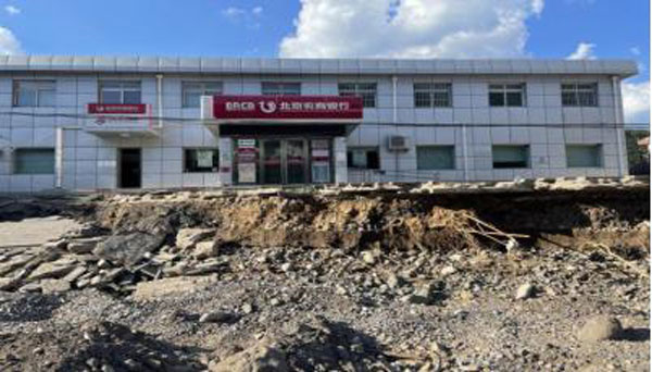 暴雨过后门头沟城区街道满目疮痍,而处于门头沟最偏远深山区的清水镇因洪灾与外界失去了一切联系。通往清水镇的路蜿蜒曲折,两边的盘山路被暴雨冲断,车辆难以通行,北京农商银行门头沟支行清水分理处两名负责人为查看网点受灾情况,驱车绕至河北段,经过5个多小时的长途跋涉,终于抵达网点。暴雨洪灾后的清水镇失去了往日的喧嚣,断路、断水、断电、断通讯,基础设施遭到惨重破坏,清水分理处前院的道路几乎消失了几百米,两台挖掘机正在不断地清理杂乱的石头,争分夺秒修复路面。北京农商银行两名网点负责人迅速检查办公电器、水电接口、楼体等情况,网点院子里随处可见被暴风雨卷过的墙面、地面和遍地散落的垃圾。因预判降雨来临,网点已提前关好门窗切断电源,营业厅也没有进水。经过救援队、镇政府等多方联动,这个小镇正在迅速恢复生产生活秩序,作为这个区域唯一银行机构,清水分理处正以最快的速度协调后续修缮恢复工作,保障这里的居民及时享受完备的金融服务。