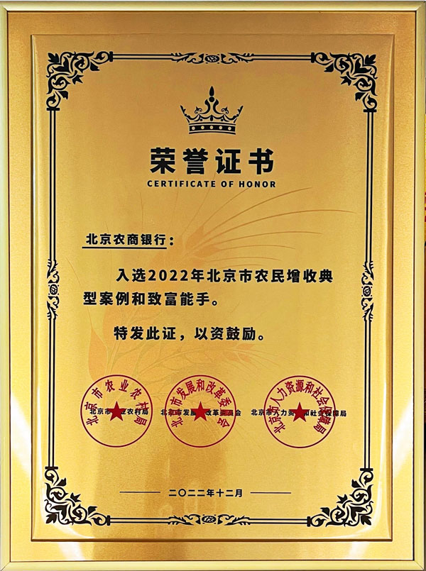 促进农民增收不仅是乡村振兴的中心任务,更是首都推进共同富裕的题中之义。2022年,市农业农村局、市发展改革委、市人力社保局联合开展农民增收典型案例和致富能手评选活动。经组织申报、专家评审、现场核查等程序,从200余个参评案例中推选23个农民增收典型案例和17个致富能手。其中,北京农商银行“创新特色金融产品 促进农民持续增收”获评2022年北京市农民增收典型案例。