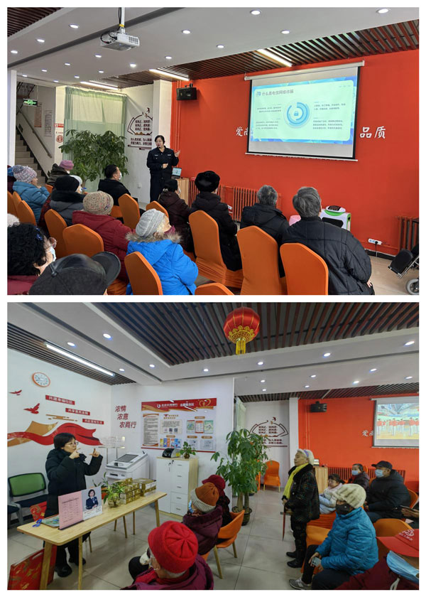 通过赋能社区已有的公益驿站,在大兴区海子角南里社区落地首家养老主题“浓情驿站”,打造有温度的适老化金融服务。针对老年人辨别能力较差、防范意识较弱的特点,通过与大兴反诈中心“警银共建”,面向老年人宣讲基础金融知识,以专业数据和生动案例介绍生活中常见的电信网络诈骗方式和应对方式,提高老年人反诈安全意识,将基础金融服务送到老百姓家门口,积极践行养老助老社会责任。