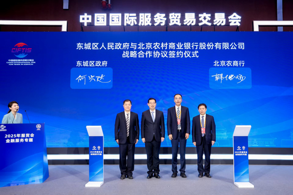 2025年9月11日,在2025年中国国际服务贸易交易会北京首钢园区会场,北京市东城区人民政府与北京农商银行签订战略合作协议。东城区委副书记、区长陈献森,东城区政府党组成员、副区长何兴达,北京农商银行党委书记、董事长关文杰,党委常委、副行长韩继炀及相关领导出席签约仪式。