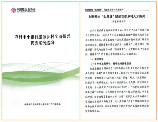 近日,中国银行业协会农村中小银行工作委员会正式发布《农村中小银行服务乡村全面振兴优秀案例选编》(以下简称《案例选编》)。北京农商银行报送的“创新推出‘头雁贷’,赋能首都人才振兴”成功入选该《案例选编》。